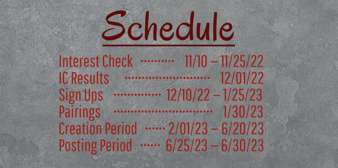 Gift exchanges are events where you create a gift for someone, and receive one as well! When you sign up for the event, you'll be asked a number of questions in order for your gifter to create something catered specifically to you, and you'll receive the same form for someone else that you'll base your gift off. The more you add, the more information your gifter has to work with!